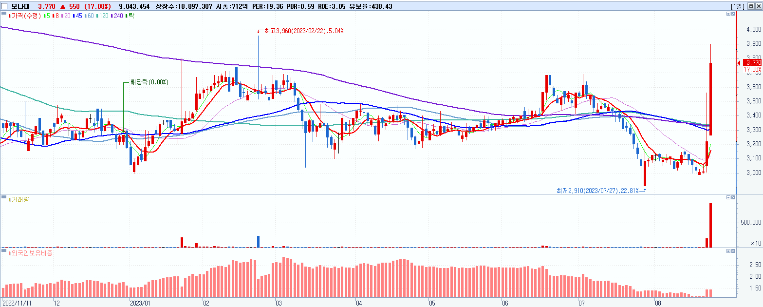 - 모나미 (3,770원 ▲ 17.08% , 시총: 712억, 거래량: 9,055,327, 거래대금:331억)