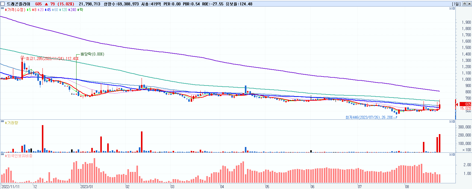 - 드래곤플라이 (605원 ▲ 15.02% , 시총: 420억, 거래량: 21,800,922, 거래대금:135억)