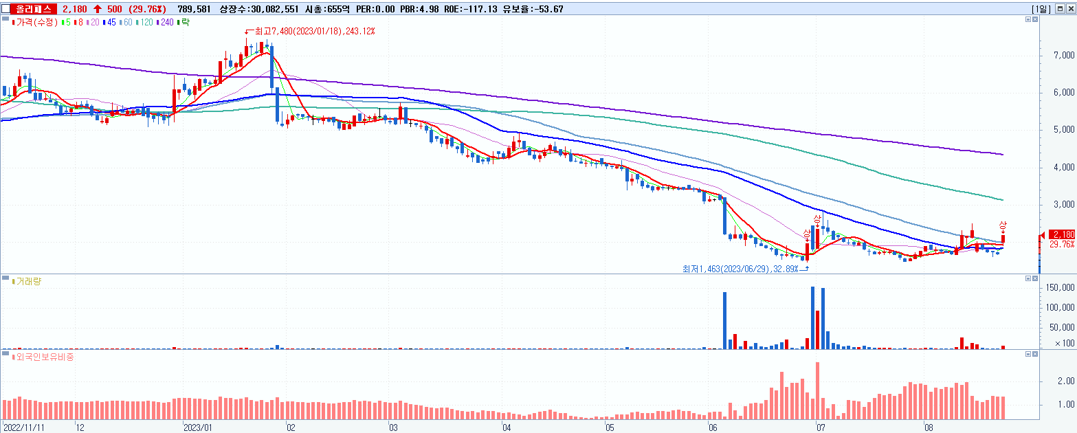 - 올리패스 (2,180원 ▲ 29.76% , 시총: 656억, 거래량: 789,581, 거래대금:17억)