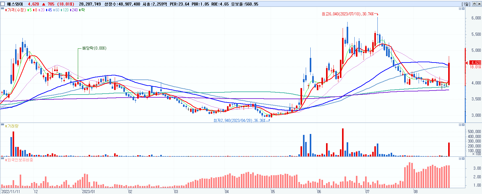 - 에스와이 (4,620원 ▲ 18.01% , 시총: 2,260억, 거래량: 28,297,563, 거래대금:1,292억)