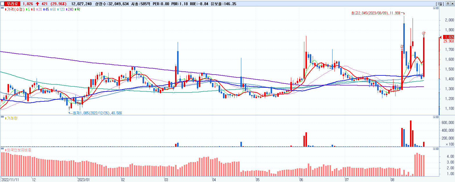 - 우리로 (1,826원 ▲ 29.96% , 시총: 585억, 거래량: 12,027,240, 거래대금:206억)