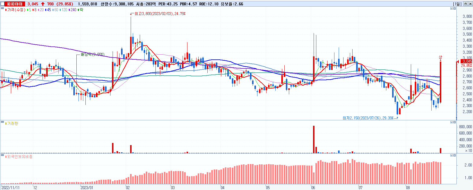 - 피피아이 (3,045원 ▲ 29.85% , 시총: 283억, 거래량: 1,559,088, 거래대금:45억)