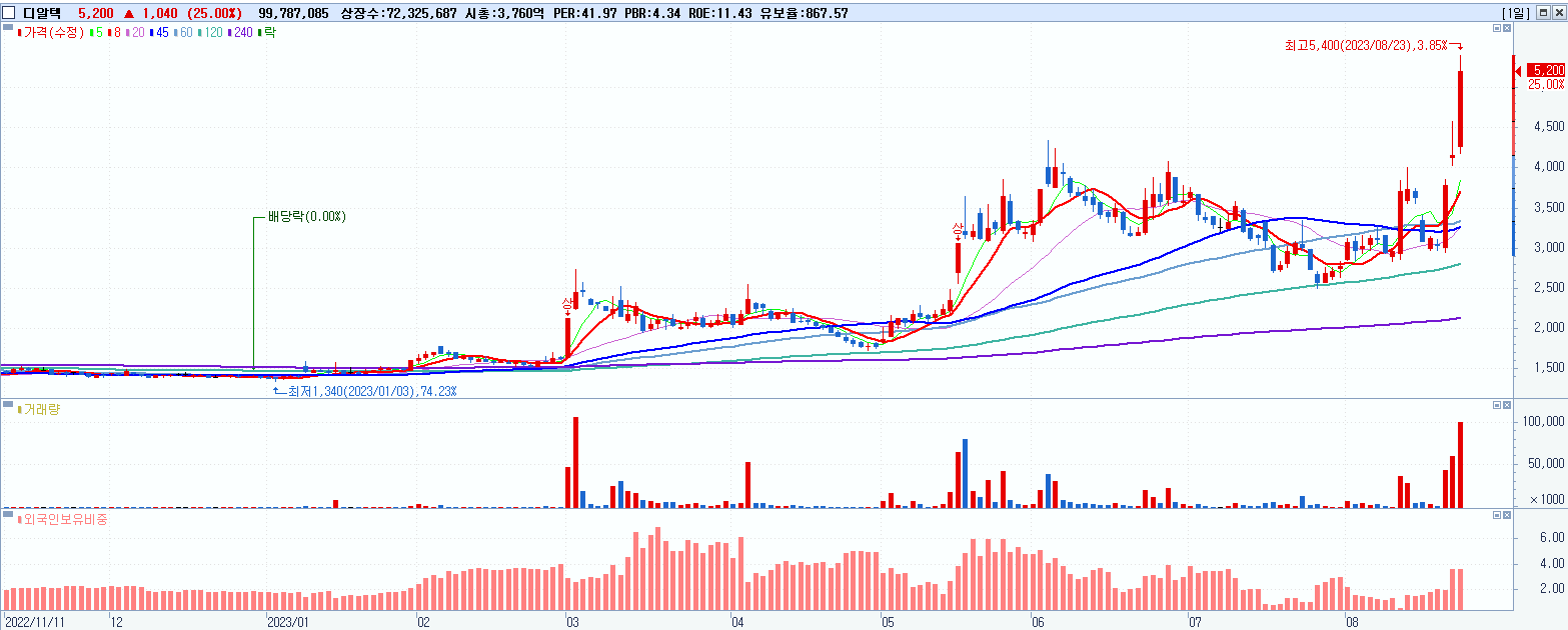 - 디알텍 (5,200원 ▲ 25% , 시총: 3,761억, 거래량: 99,958,276, 거래대금:4,949억)