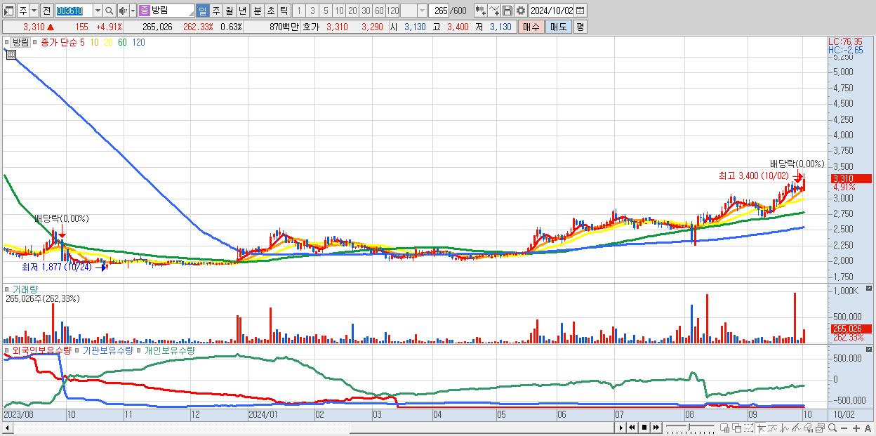 - 방림 (3,310원 ▲ 4.91% , 시총: 1,401억, 거래량: 265,026, 거래대금:9억, KOSPI)