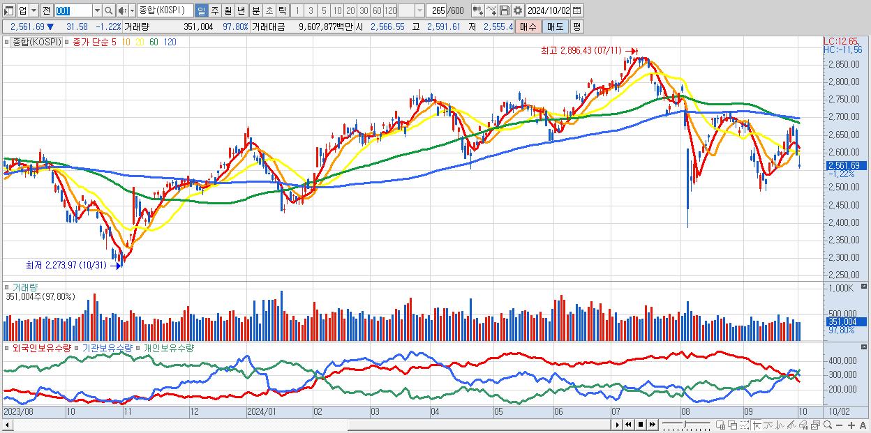 10/02 | 2,561.69 | ▼-1.22% | 9,868억 | -3,048억 | -7,060억 | 239억 |