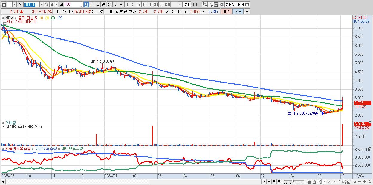- NEW (2,725원 ▲ 13.07% , 시총: 760억, 거래량: 6,047,089, 거래대금:167억)