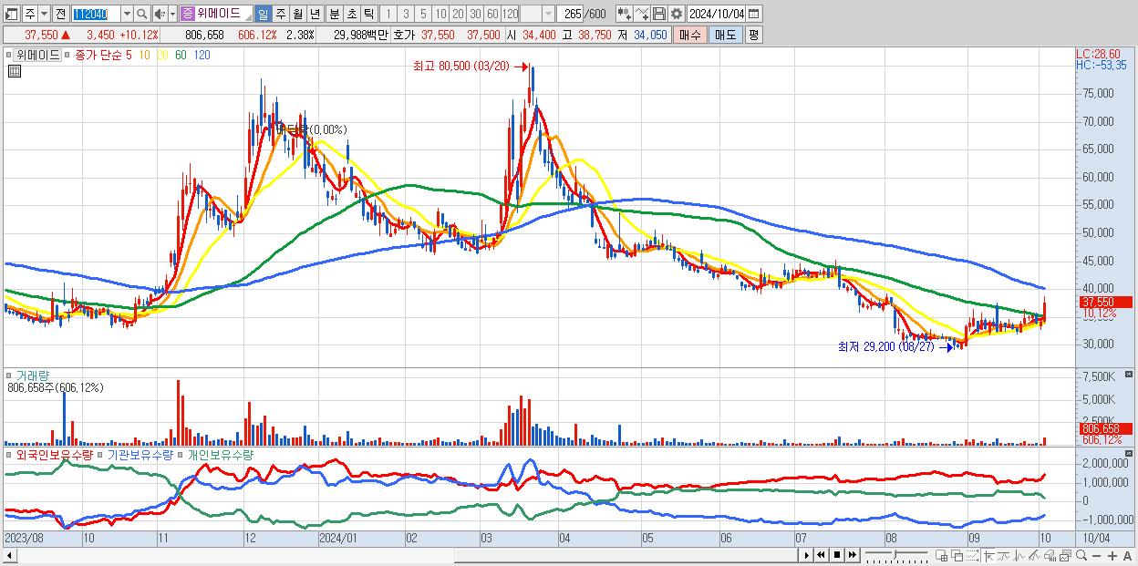 - 위메이드 (37,550원 ▲ 10.12% , 시총: 12,748억, 거래량: 806,658, 거래대금:300억)