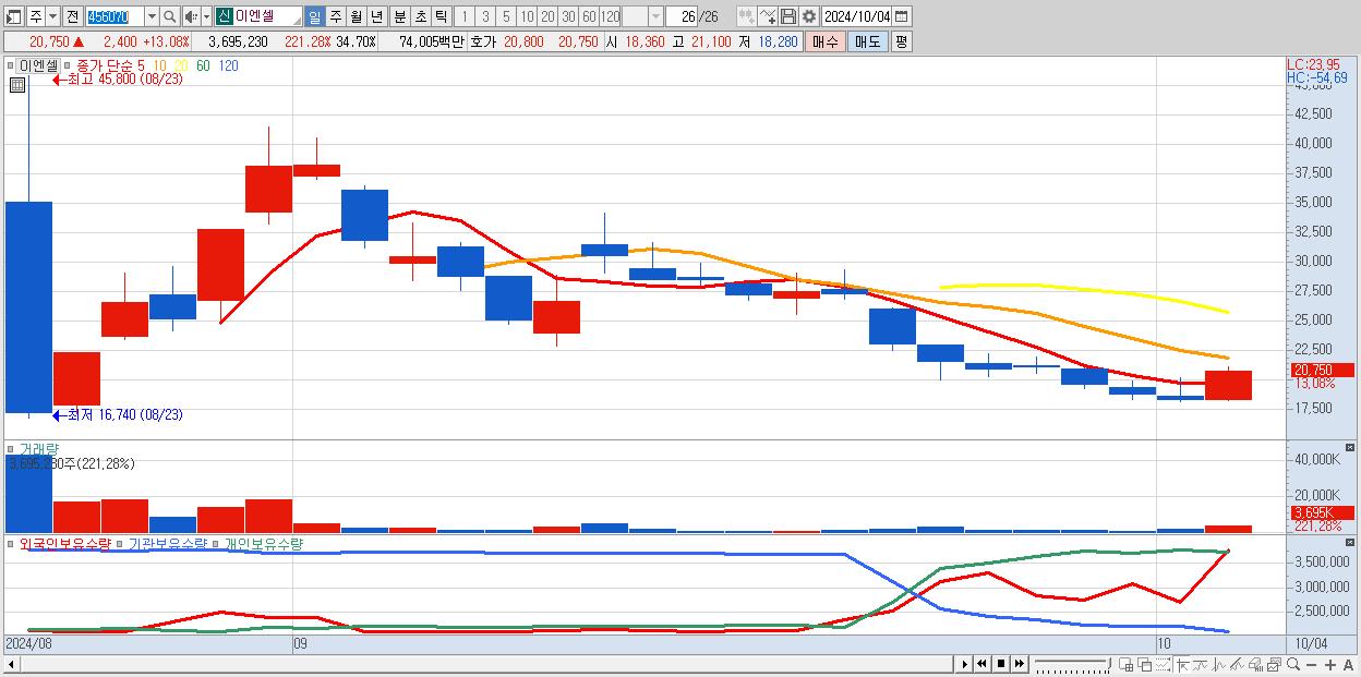 - 이엔셀 (20,750원 ▲ 13.08% , 시총: 2,210억, 거래량: 3,695,230, 거래대금:740억)