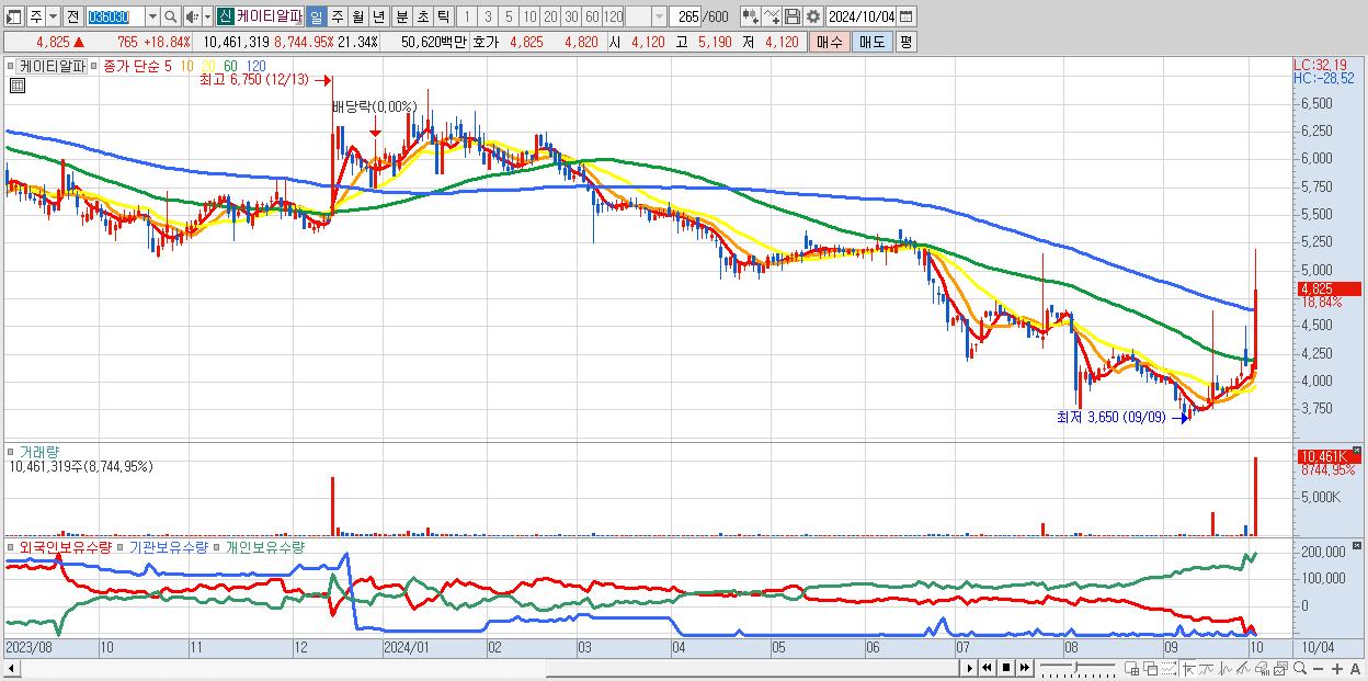- 케이티알파 (4,825원 ▲ 18.84% , 시총: 2,365억, 거래량: 10,461,319, 거래대금:506억)