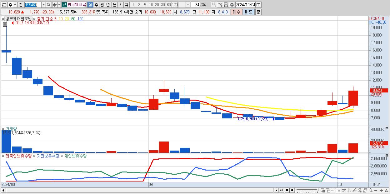 - 뱅크웨어글로벌 (10,620원 ▲ 20% , 시총: 1,062억, 거래량: 15,577,504, 거래대금:1,589억)