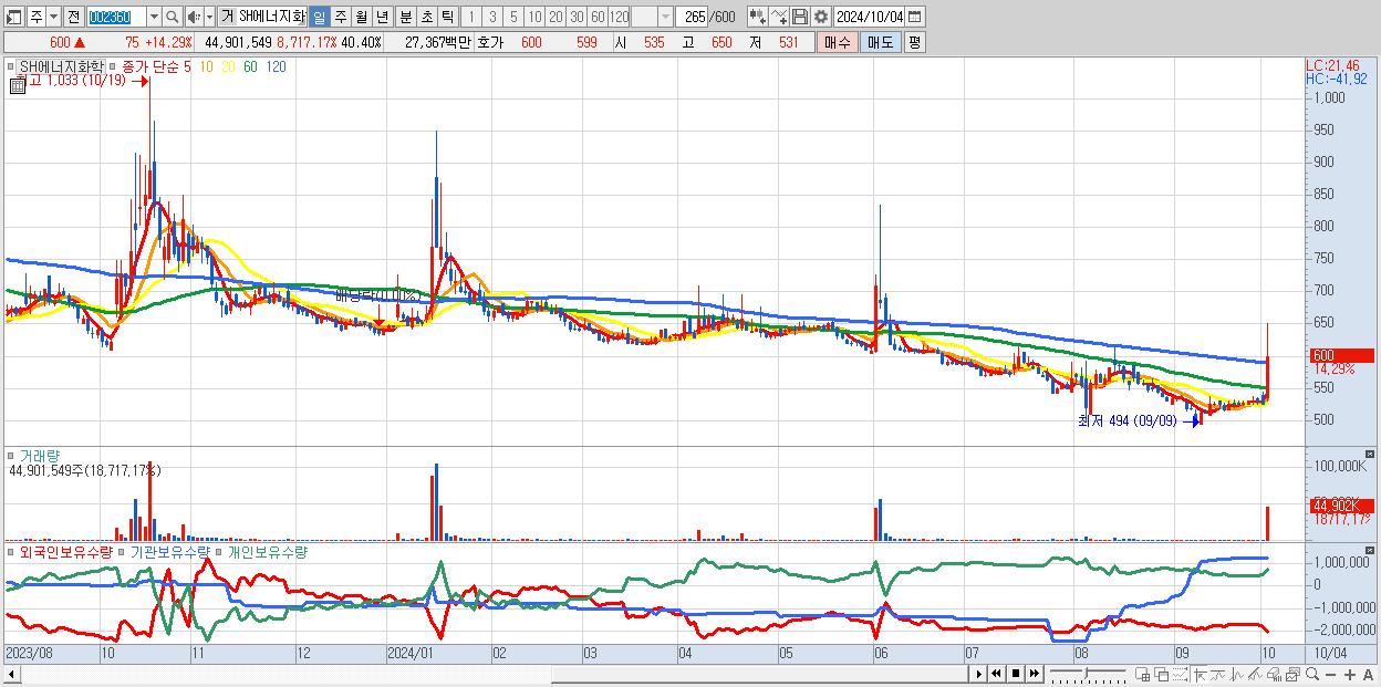 - SH에너지화학 (600원 ▲ 14.29% , 시총: 667억, 거래량: 44,901,549, 거래대금:274억)