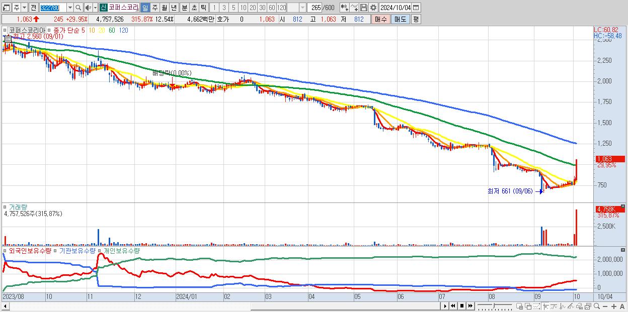 - 코퍼스코리아 (1,063원 ▲ 29.95% , 시총: 403억, 거래량: 4,757,526, 거래대금:47억)