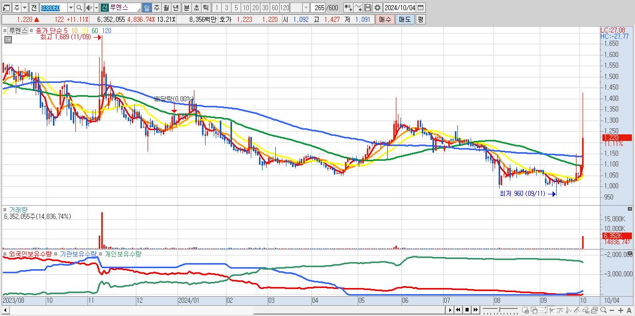 - 루멘스 (1,220원 ▲ 11.11% , 시총: 587억, 거래량: 6,352,055, 거래대금:84억)
