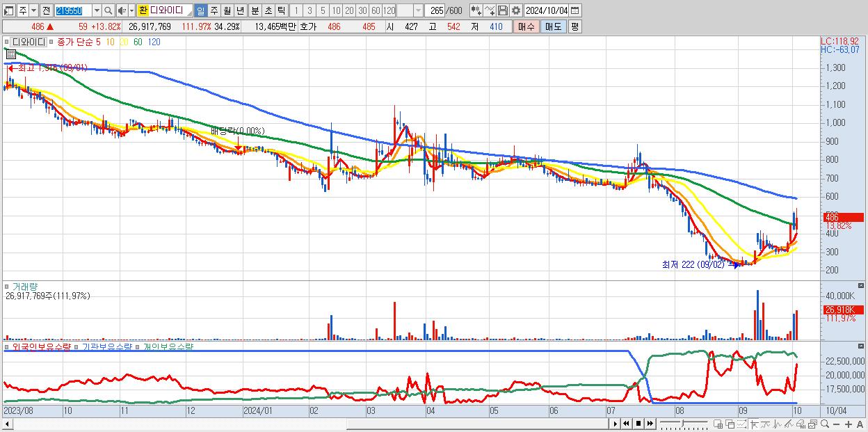 - 디와이디 (486원 ▲ 13.82% , 시총: 382억, 거래량: 26,917,769, 거래대금:135억)