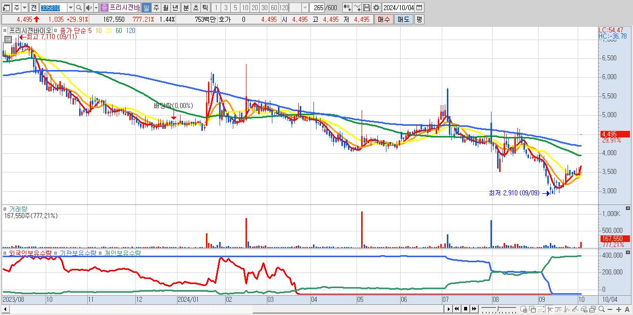 - 프리시젼바이오 (4,495원 ▲ 29.91% , 시총: 522억, 거래량: 167,550, 거래대금:8억)