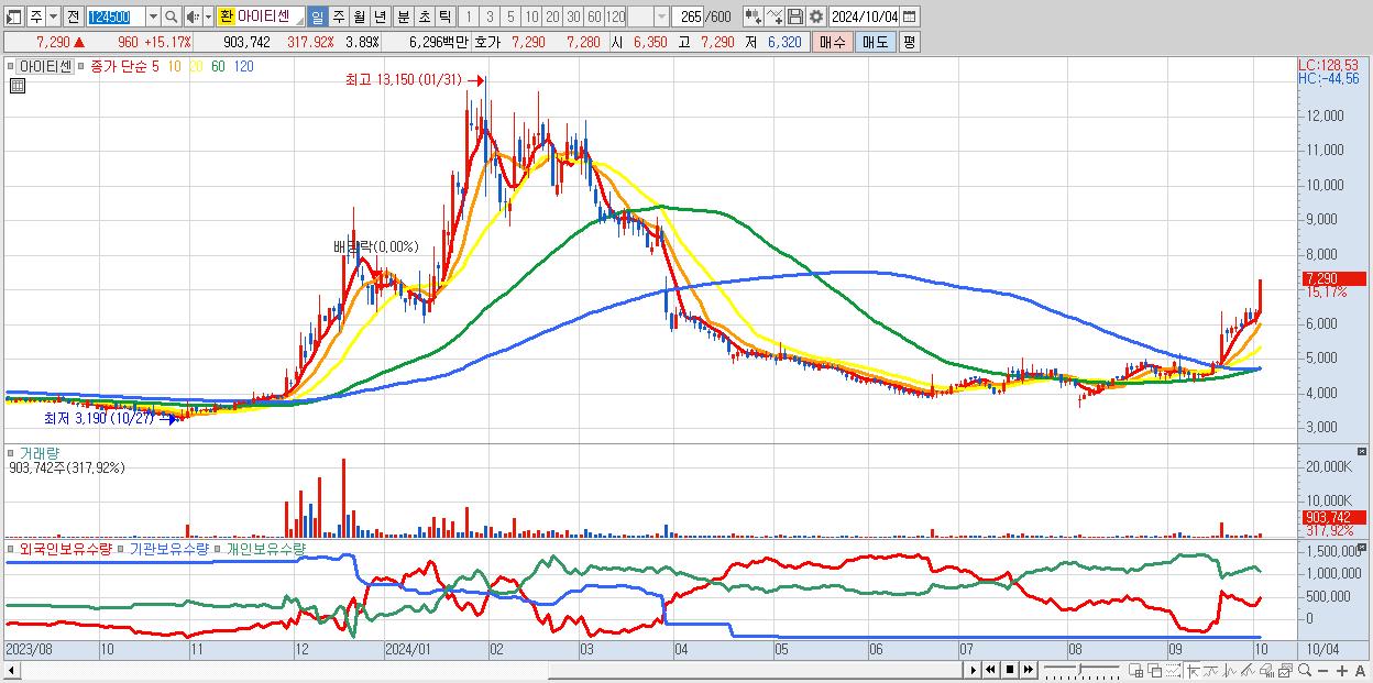- 아이티센 (7,290원 ▲ 15.17% , 시총: 1,692억, 거래량: 903,742, 거래대금:63억)