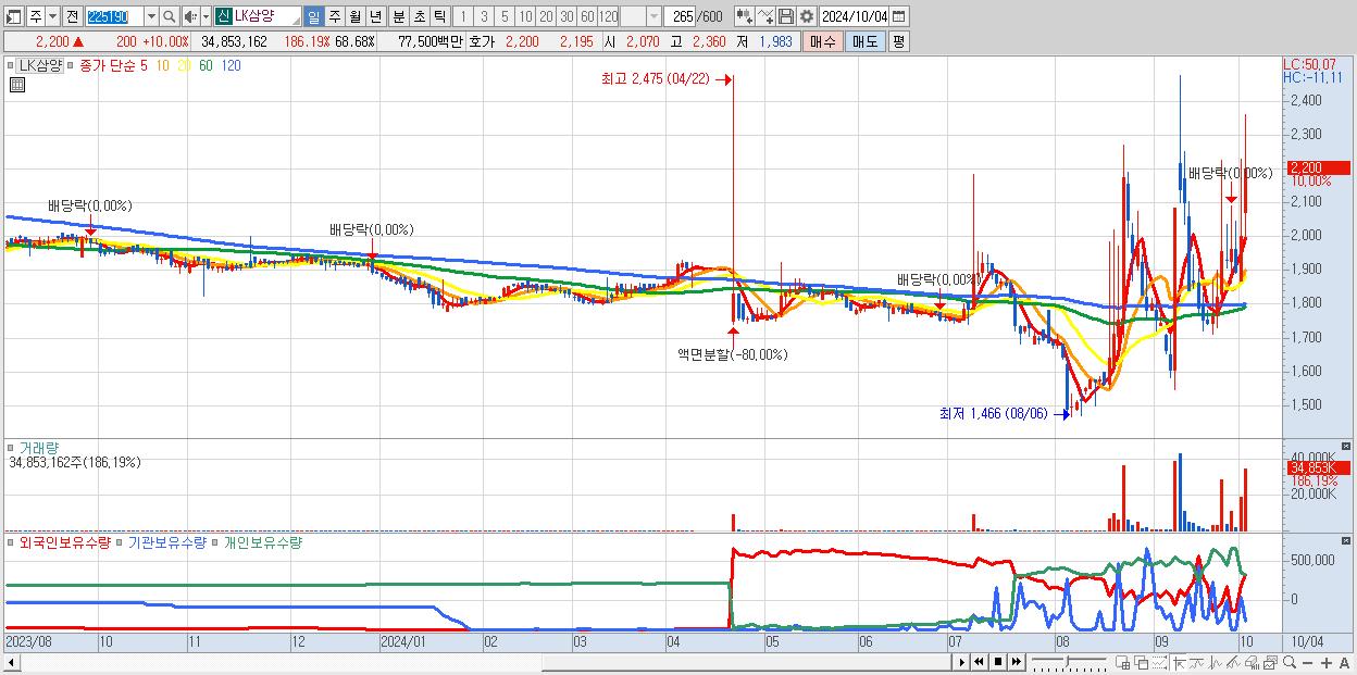 - LK삼양 (2,200원 ▲ 10% , 시총: 1,116억, 거래량: 34,853,162, 거래대금:775억)