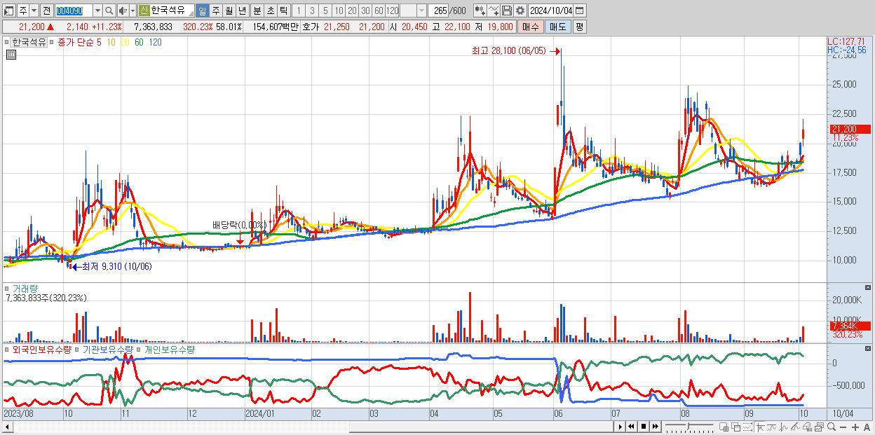 - 한국석유 (21,200원 ▲ 11.23% , 시총: 2,691억, 거래량: 7,363,833, 거래대금:1,546억)