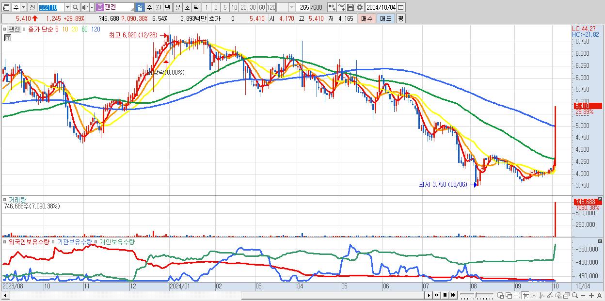 - 팬젠 (5,410원 ▲ 29.89% , 시총: 618억, 거래량: 746,688, 거래대금:39억)