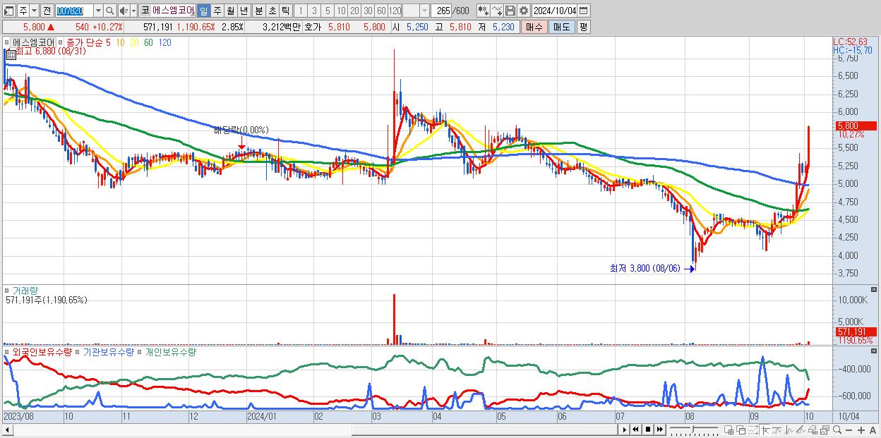 - 에스엠코어 (5,800원 ▲ 10.27% , 시총: 1,162억, 거래량: 571,191, 거래대금:32억)
