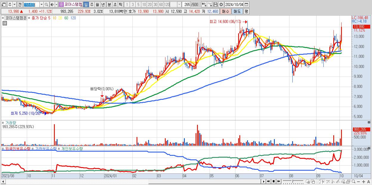 - 코아스템켐온 (13,990원 ▲ 11.12% , 시총: 4,599억, 거래량: 993,265, 거래대금:138억)