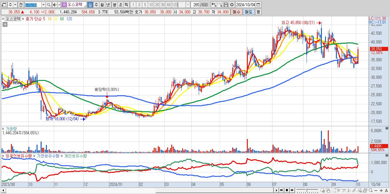 - 오스코텍 (38,050원 ▲ 12.08% , 시총: 14,552억, 거래량: 1,440,204, 거래대금:535억)