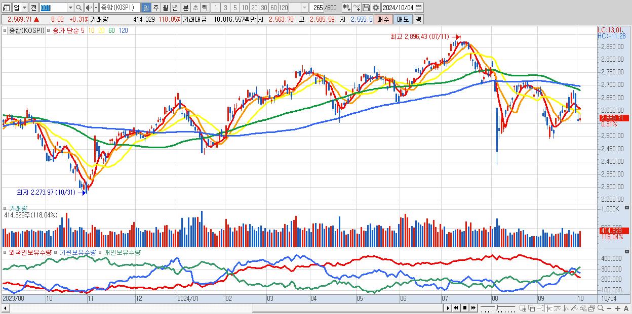 10/04 | 2,569.71 | ▲0.31% | 672억 | 428억 | -2,168억 | 1,068억 |