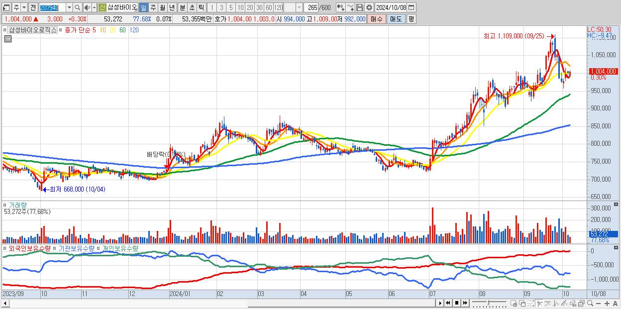- 삼성바이오로직스 (1,004,000원 ▲ 0.3% , 시총: 714,587억, 외국인 순매수 거래금:55억)