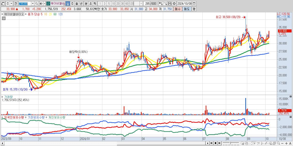 - 에이비엘바이오 (33,900원 ▲ 5.28% , 시총: 16,288억, 외국인 순매수 거래금:54억)