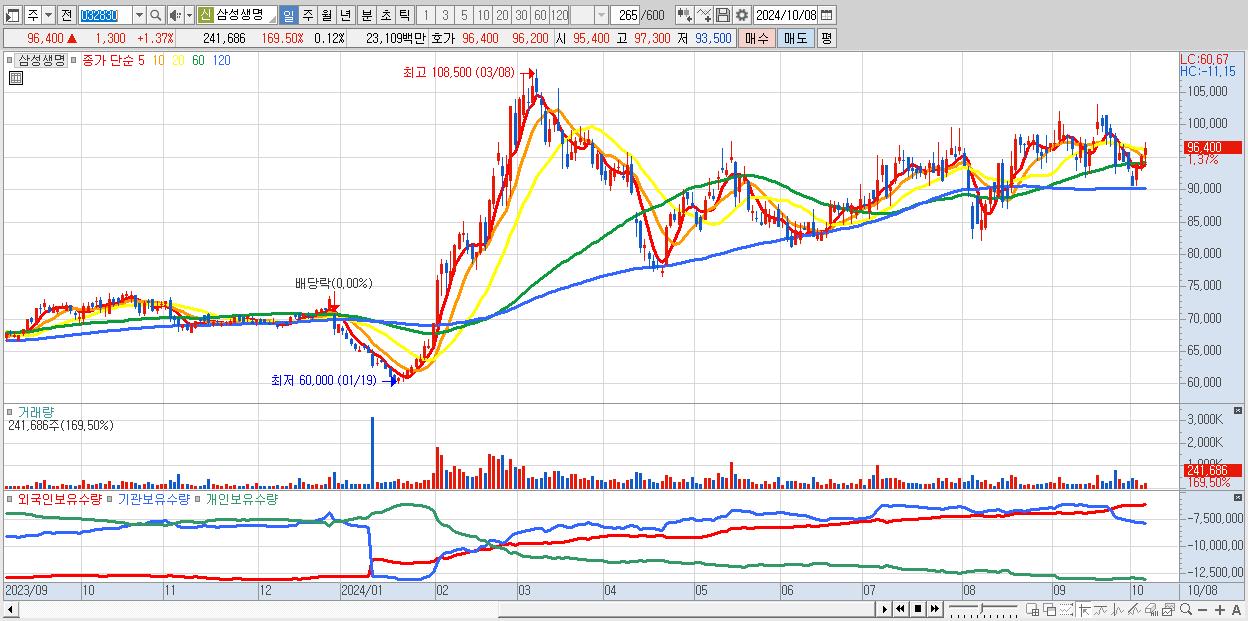 - 삼성생명 (96,400원 ▲ 1.37% , 시총: 192,800억, 외국인 순매수 거래금:93억)