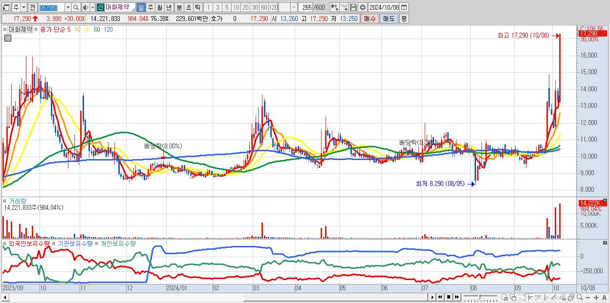 - 대화제약 (17,290원 ▲ 30% , 시총: 3,219억, 거래량: 14,221,833, 거래대금:2,296억, KOSDAQ)