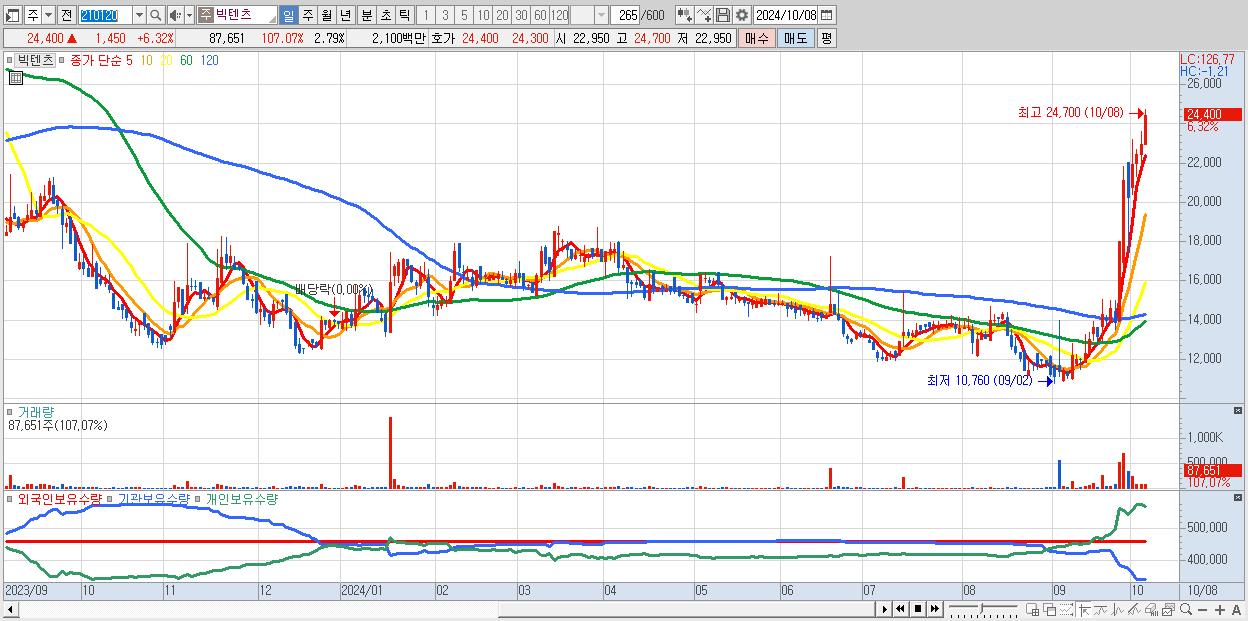 - 빅텐츠 (24,400원 ▲ 6.32% , 시총: 767억, 거래량: 87,651, 거래대금:21억, KOSDAQ)