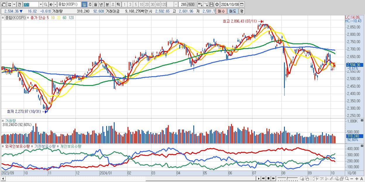 | 10/08 | 2,594.36 | ▼-0.61% | 6,978억 | -3,766억 | -3,498억 | 286억 |