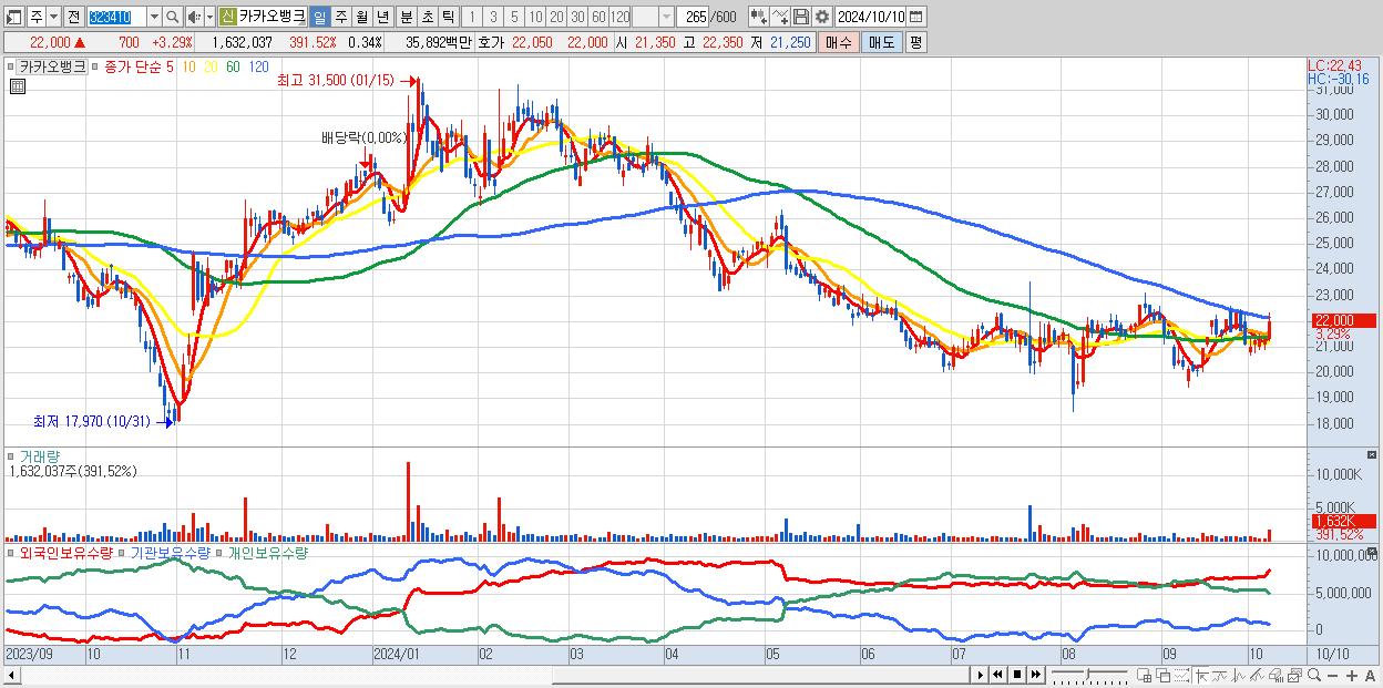 - 카카오뱅크 (22,000원 ▲ 3.29% , 시총: 104,932억, 외국인 순매수 거래금:124억)