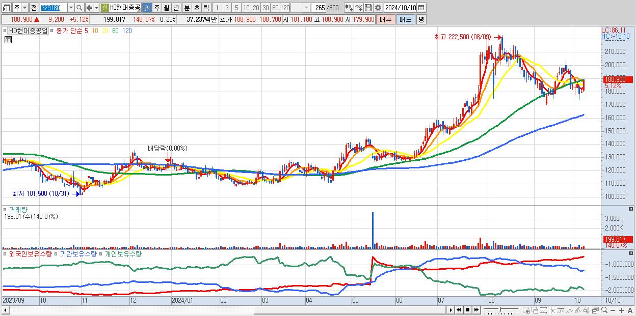 - HD현대중공업 (188,900원 ▲ 5.12% , 시총: 167,692억, 외국인 순매수 거래금:77억)