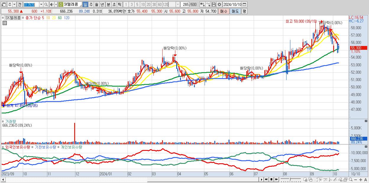 - SK텔레콤 (55,300원 ▲ 1.1% , 시총: 118,779억, 외국인 순매수 거래금:131억)