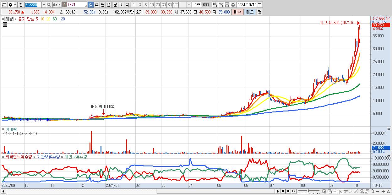 - 태성 (39,250원 ▲ 4.39% , 시총: 10,135억, 거래량: 2,163,121, 거래대금:821억, KOSDAQ)