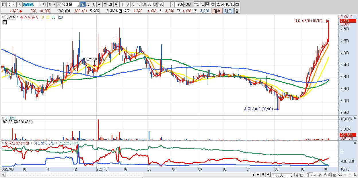 - 유엔젤 (4,670원 ▲ 8.6% , 시총: 616억, 거래량: 762,831, 거래대금:35억, KOSPI)