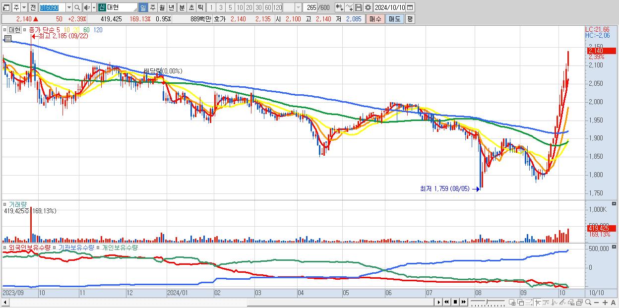 - 대현 (2,140원 ▲ 2.39% , 시총: 948억, 거래량: 419,425, 거래대금:9억, KOSPI)
