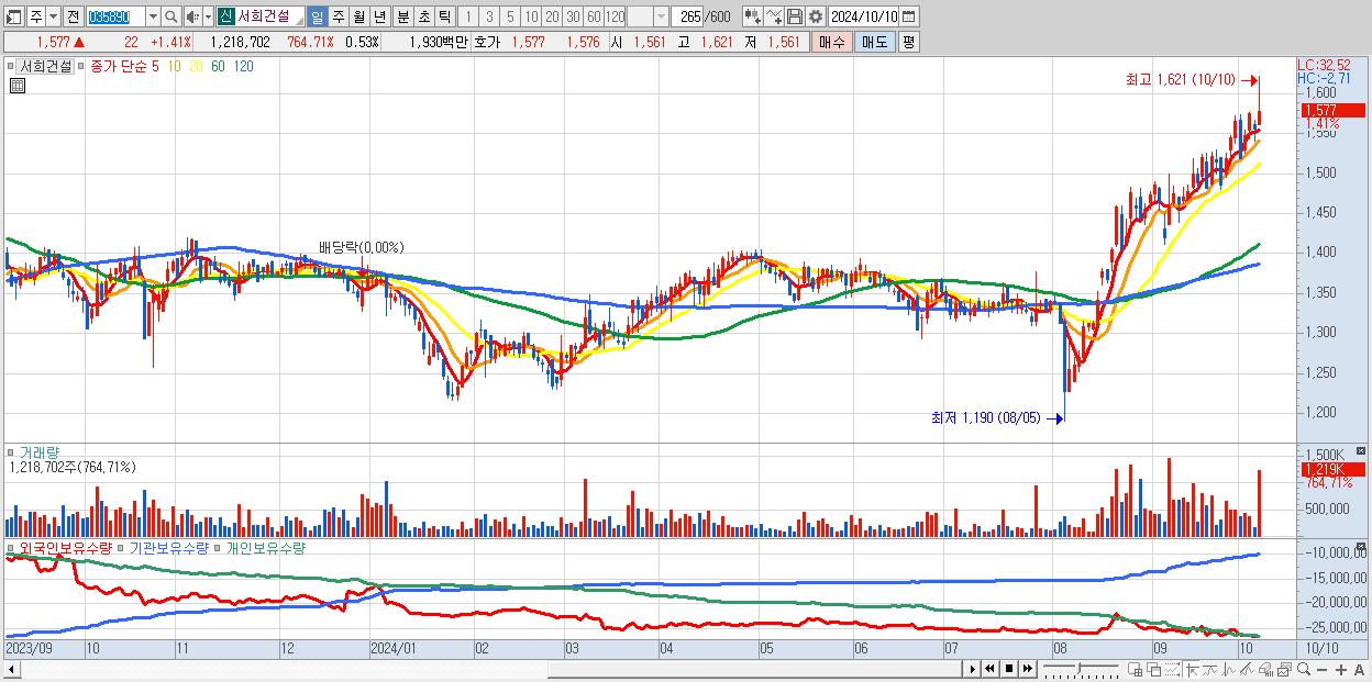 - 서희건설 (1,577원 ▲ 1.41% , 시총: 3,624억, 거래량: 1,218,702, 거래대금:19억, KOSDAQ)