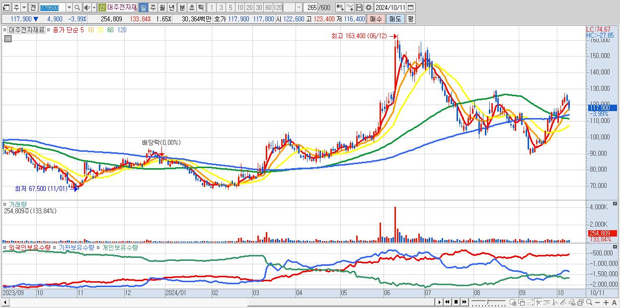 - 대주전자재료 (117,900원 ▼ -3.99% , 시총: 18,252억, 외국인 순매수 거래금:43억)
