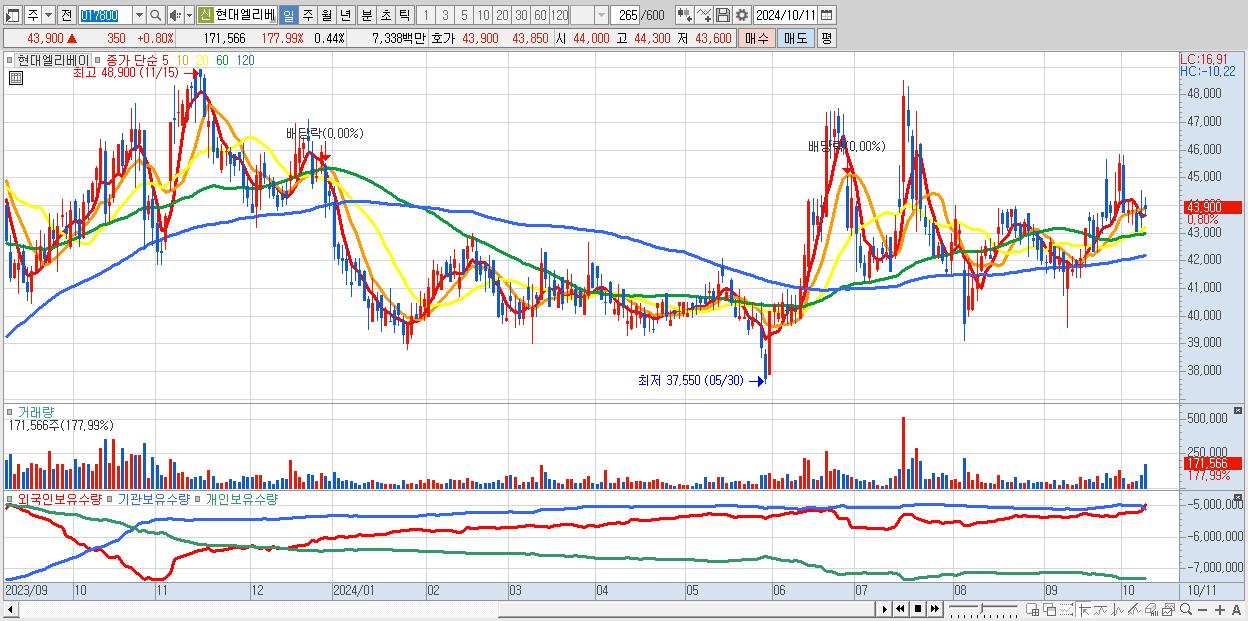 - 현대엘리베이 (43,900원 ▲ 0.8% , 시총: 17,162억, 외국인 순매수 거래금:50억)