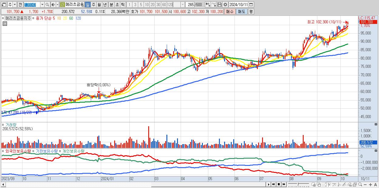 - 메리츠금융지주 (101,700원 ▲ 1.7% , 시총: 193,962억, 거래량: 200,572, 거래대금:204억, KOSPI)