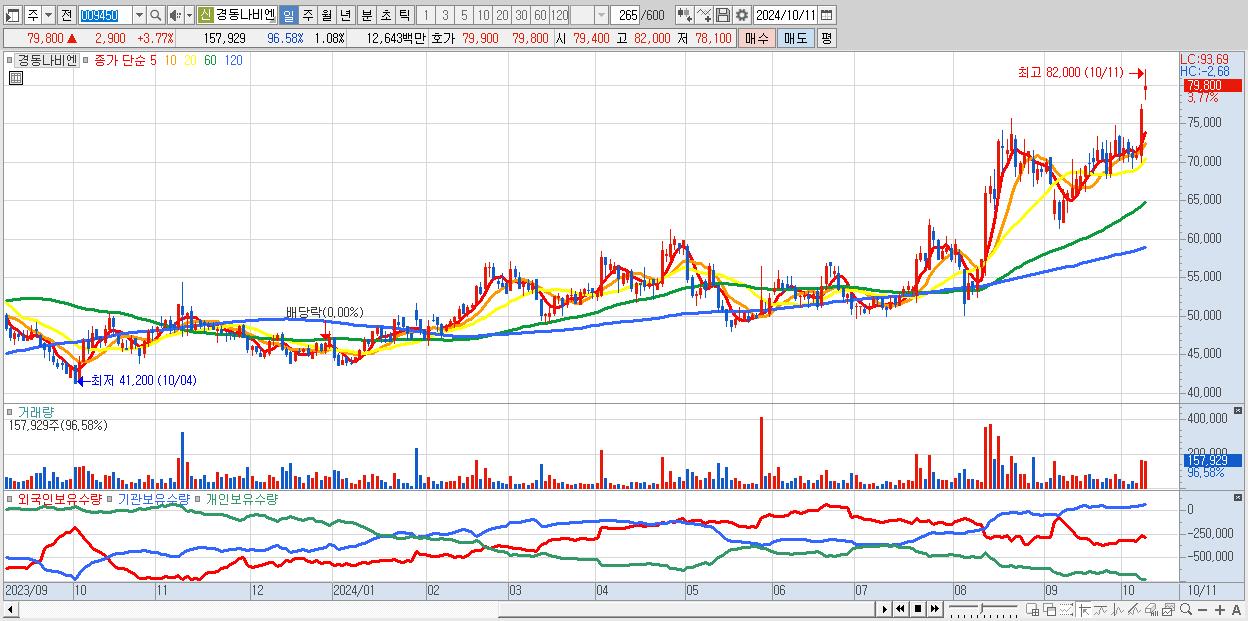 - 경동나비엔 (79,800원 ▲ 3.77% , 시총: 11,626억, 거래량: 157,929, 거래대금:126억, KOSPI)