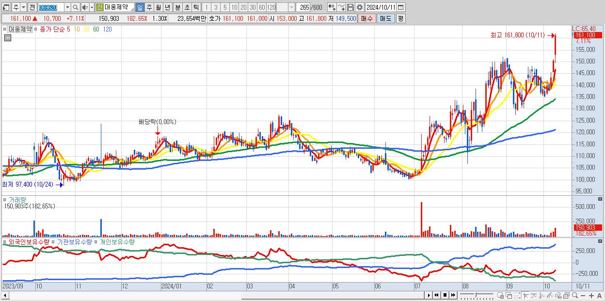 - 대웅제약 (161,100원 ▲ 7.11% , 시총: 18,666억, 거래량: 150,903, 거래대금:237억, KOSPI)