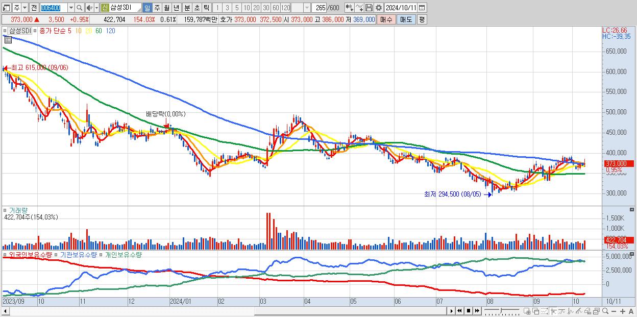 - 삼성SDI (373,000원 ▲ 0.95% , 시총: 256,492억, 거래량: 422,704, 거래대금:1,598억)