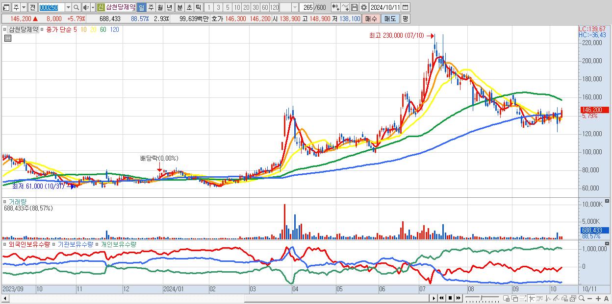 - 삼천당제약 (146,200원 ▲ 5.79% , 시총: 34,295억, 거래량: 688,433, 거래대금:996억)