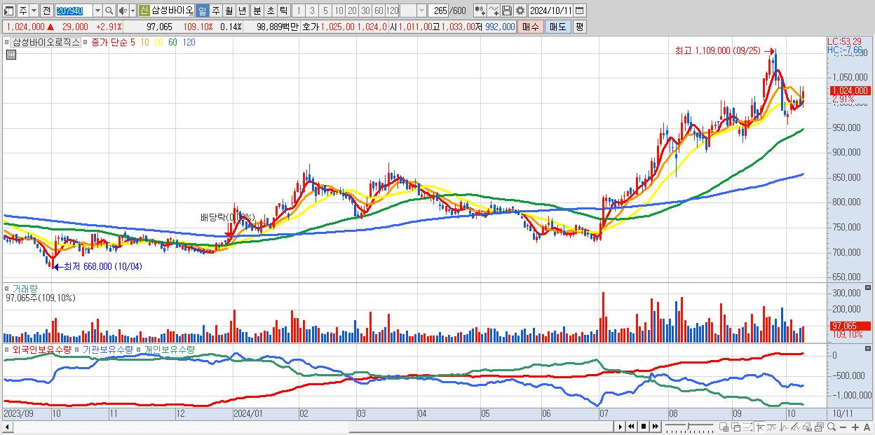 - 삼성바이오로직스 (1,024,000원 ▲ 2.91% , 시총: 728,822억, 거래량: 97,065, 거래대금:989억)