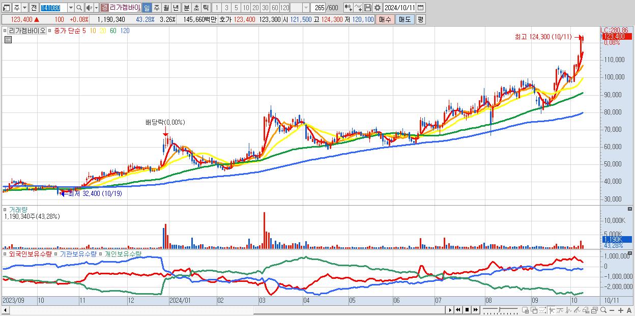- 리가켐바이오 (123,400원 ▲ 0.08% , 시총: 45,124억, 거래량: 1,190,340, 거래대금:1,457억)