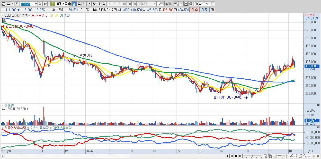 - LG에너지솔루션 (411,000원 ▼ -3.75% , 시총: 961,740억, 거래량: 441,897, 거래대금:1,845억)